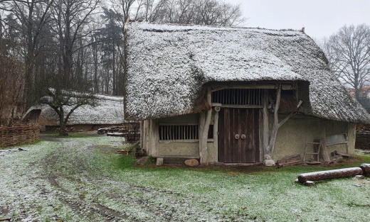 Onderstaande foto maakte Peter de Vries van het “prehistorische” dorpje behorende bij het milieu-educatief centrum in Wilhelminaoord. De foto is van 19 januari 2021 toen er ook wat lichte sneeuw viel.