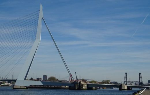 Onderstaande foto maakte Leen de Koning donderdag 9 april, de zwanenhals van de Erasmusbrug ligt al een aantal dagen in de volle zonneschijn.
